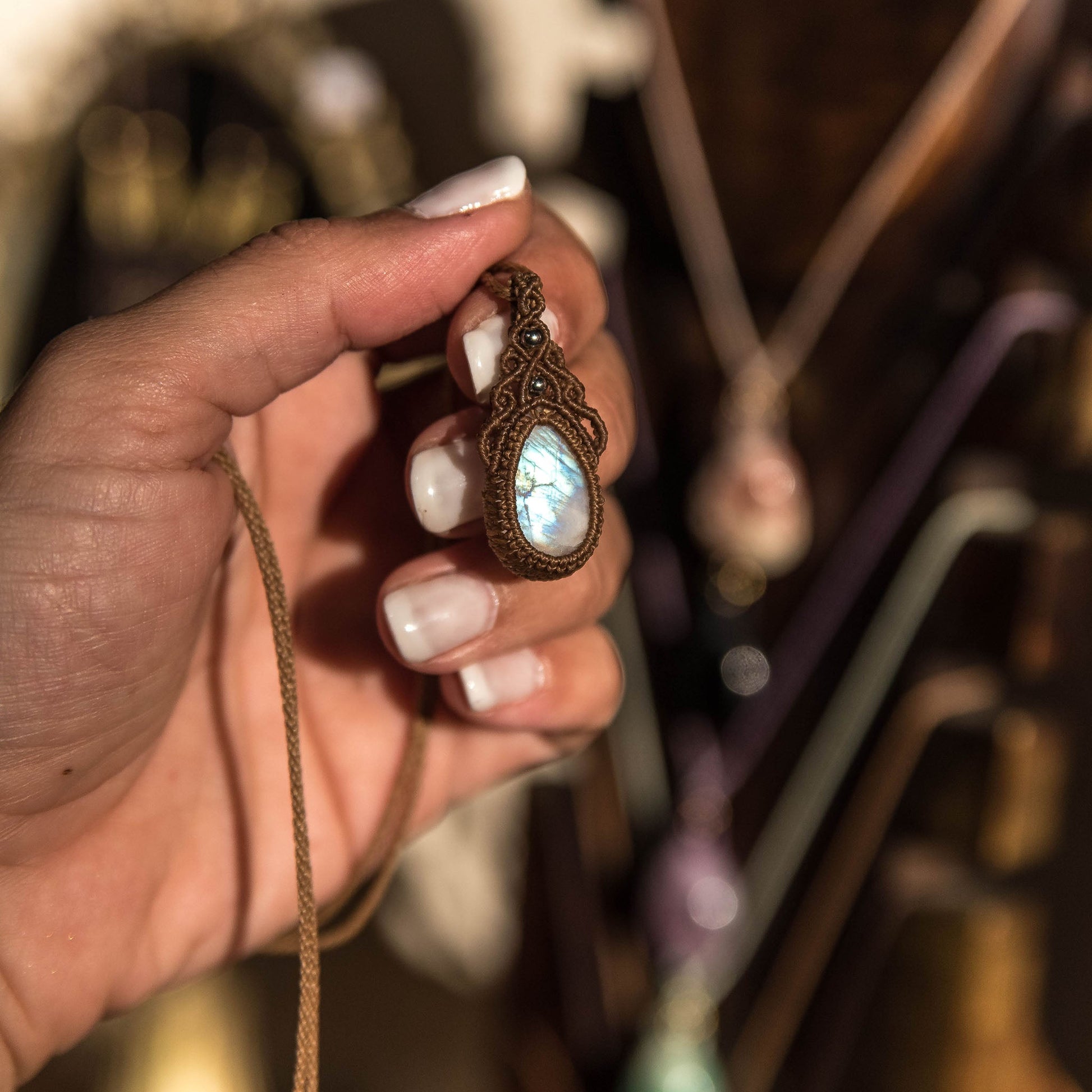 Collar con Piedra Lunar de gran calidad en marrón con detalles de acero inoxidable y cordón con nudo corredizo.