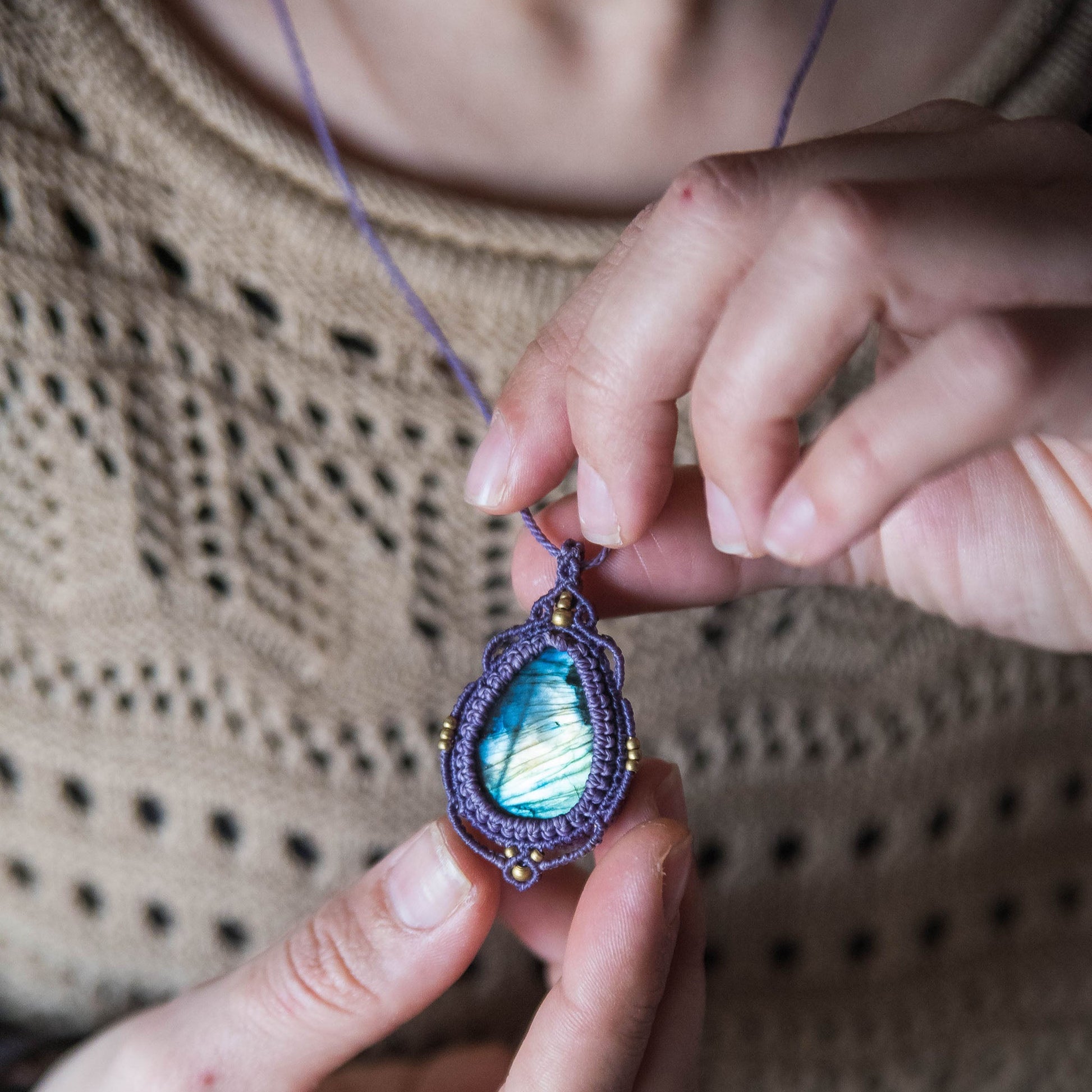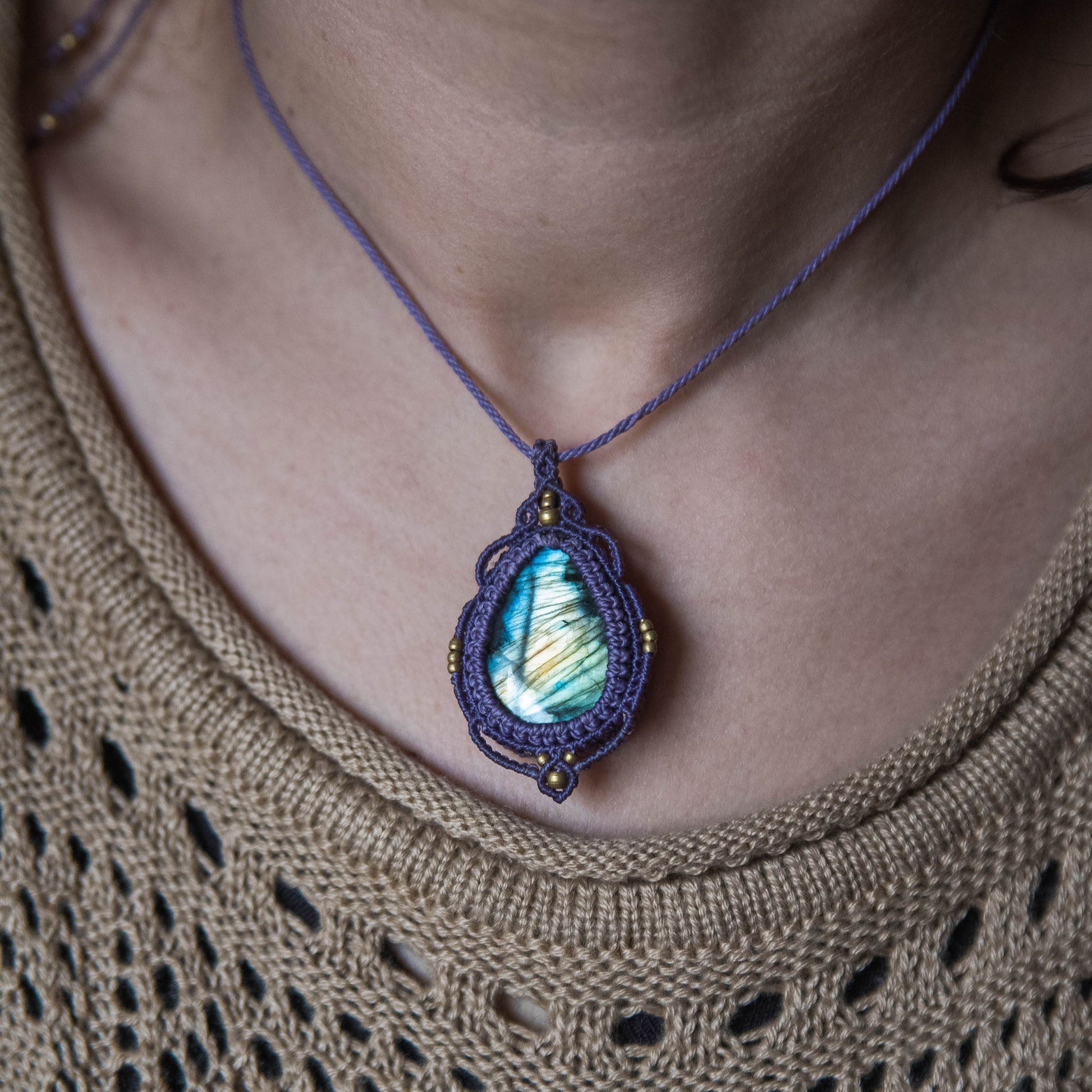 Labradorita multicolor trabajada con hilo morado y detalles de latón.