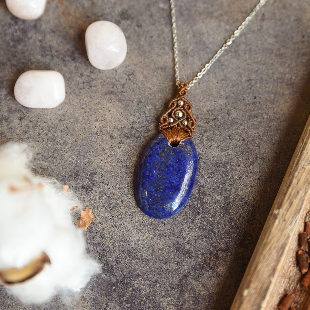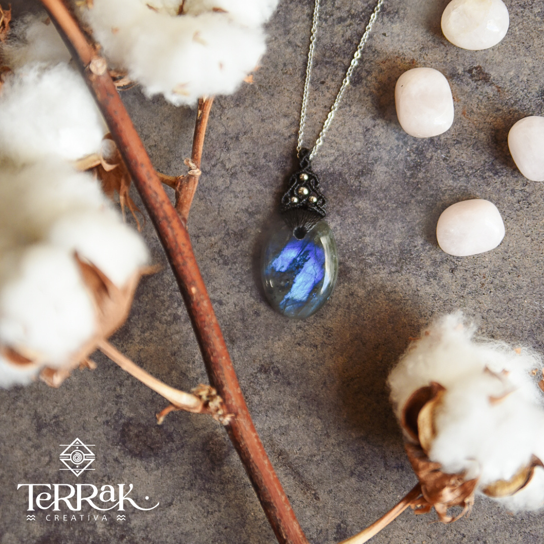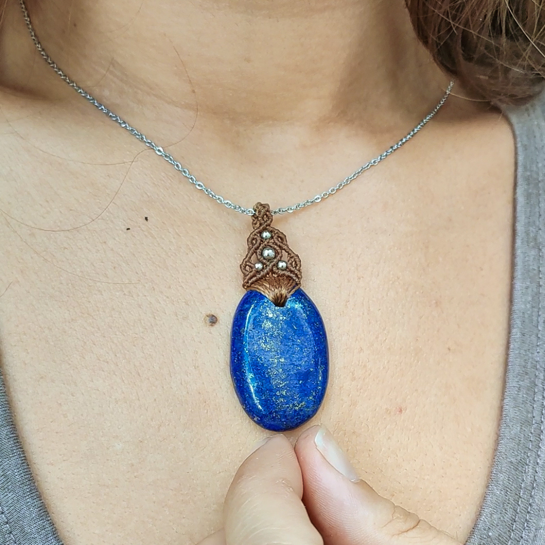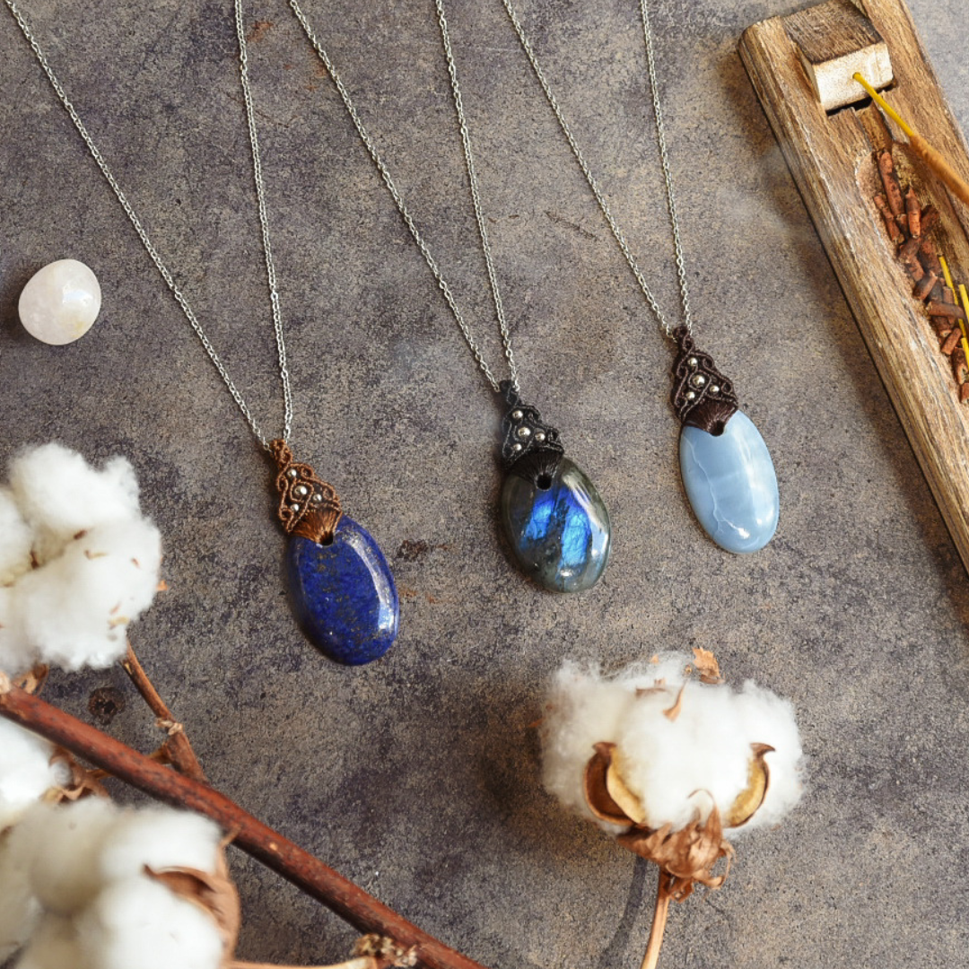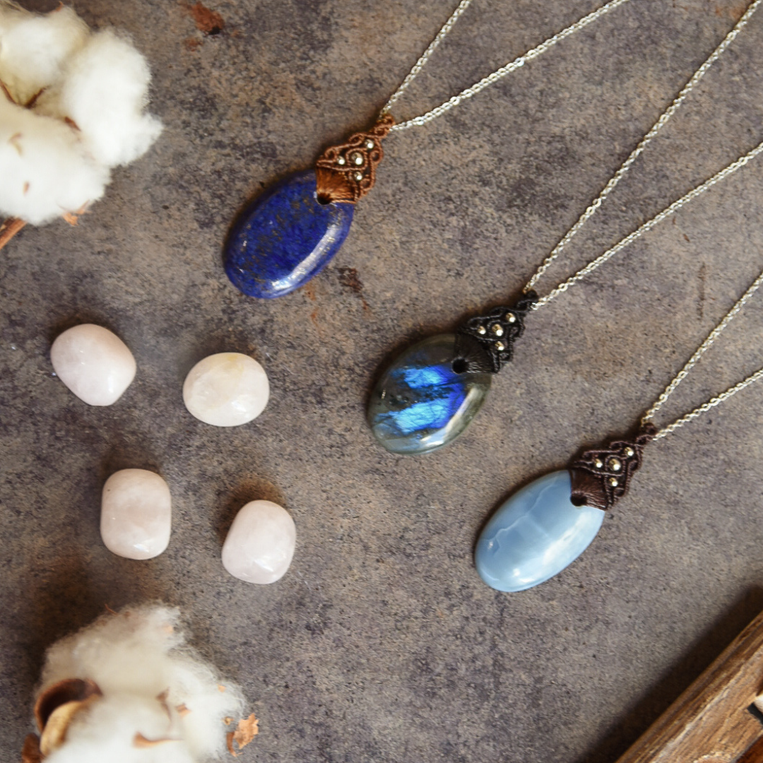 Colgantes con minerales naturales y detalles y cadena de acero inoxidable.