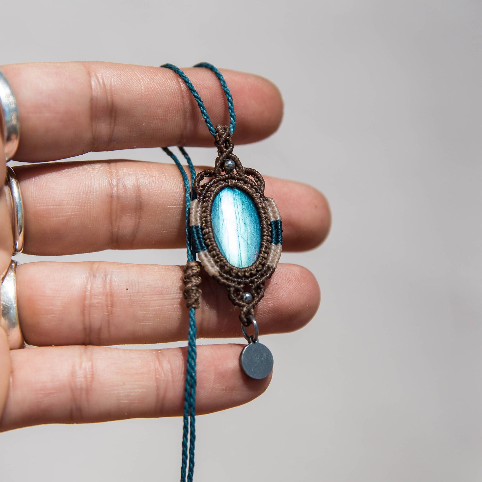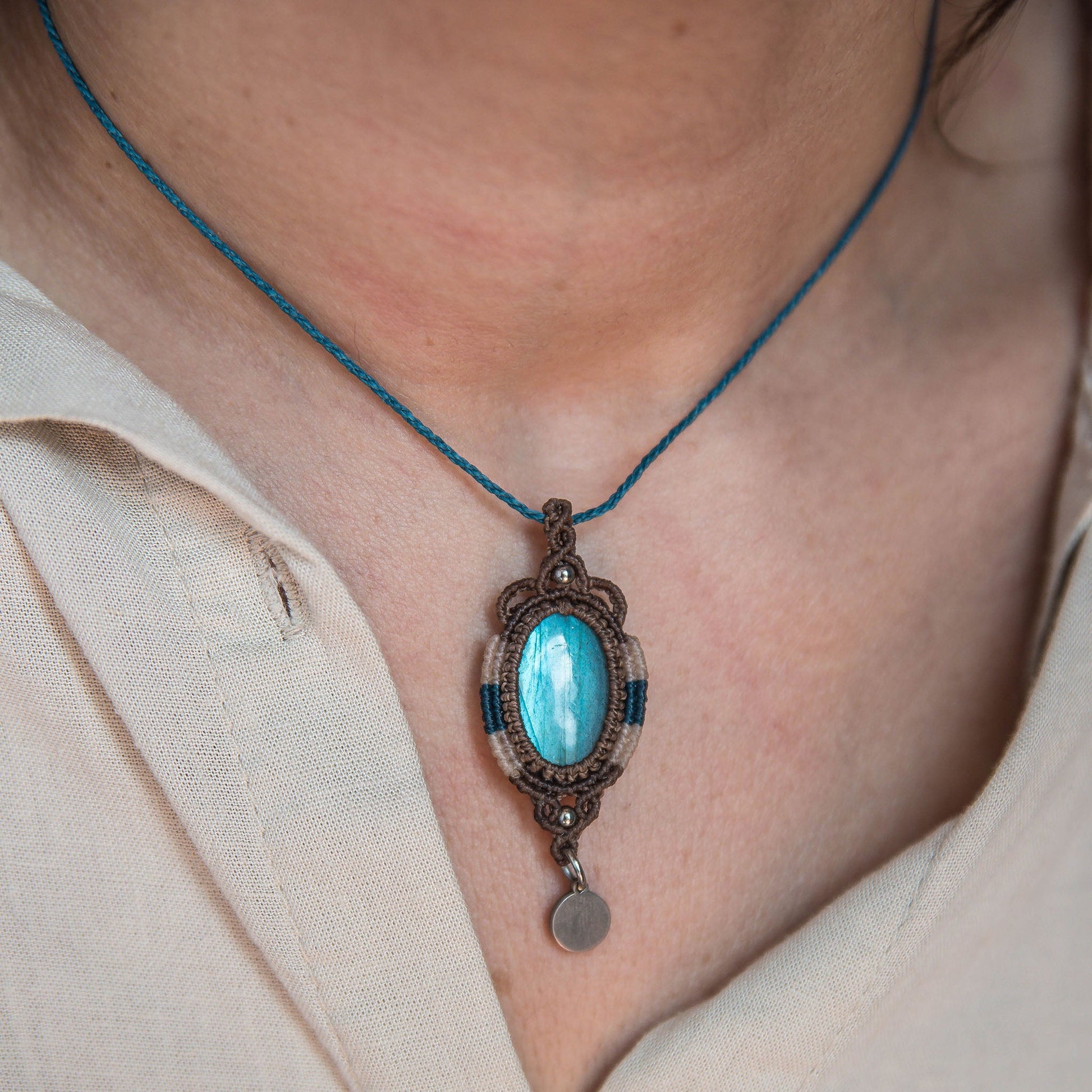 Collar con Labradorita tejido con hilos de diferentes colores y detalles de acero inoxidable plateado.