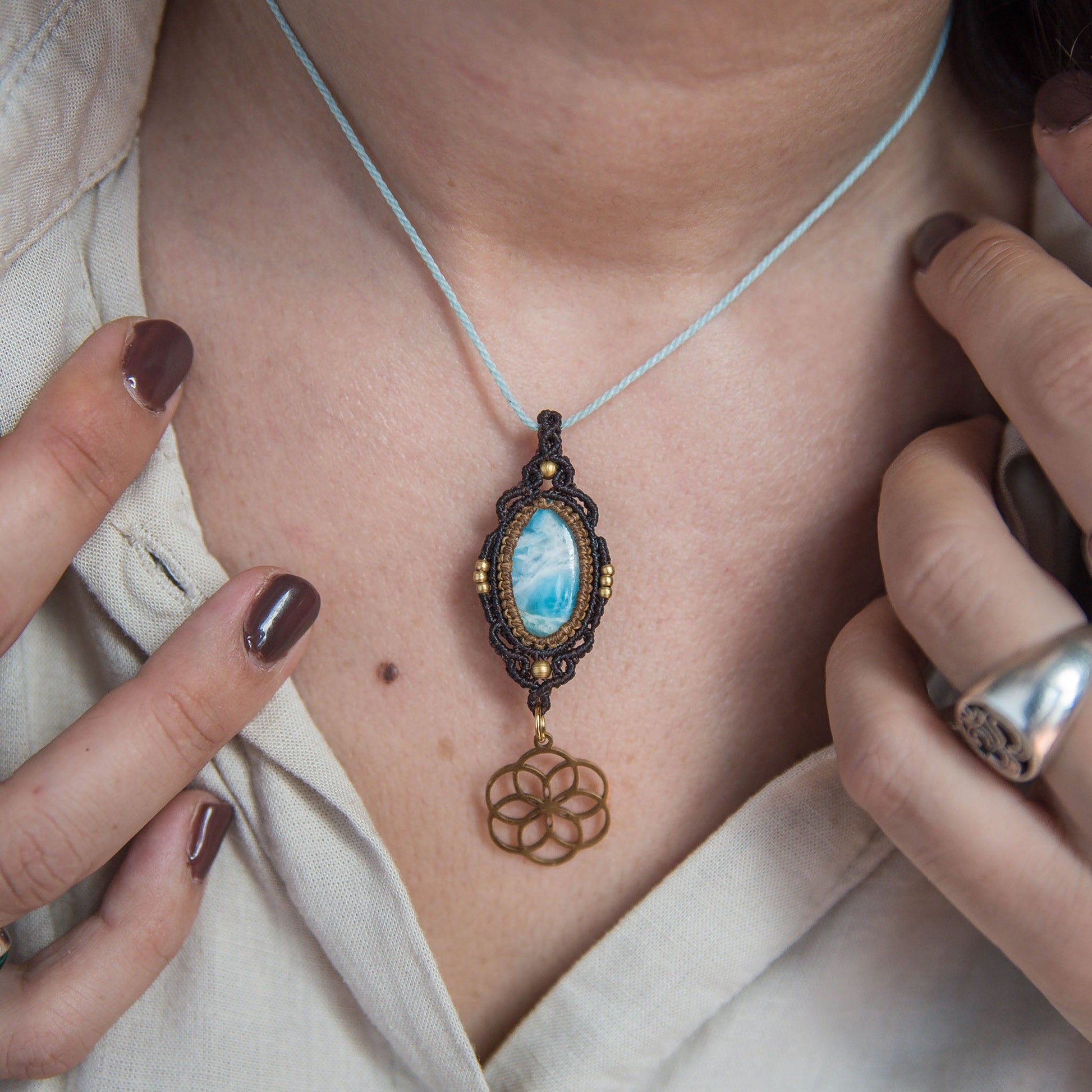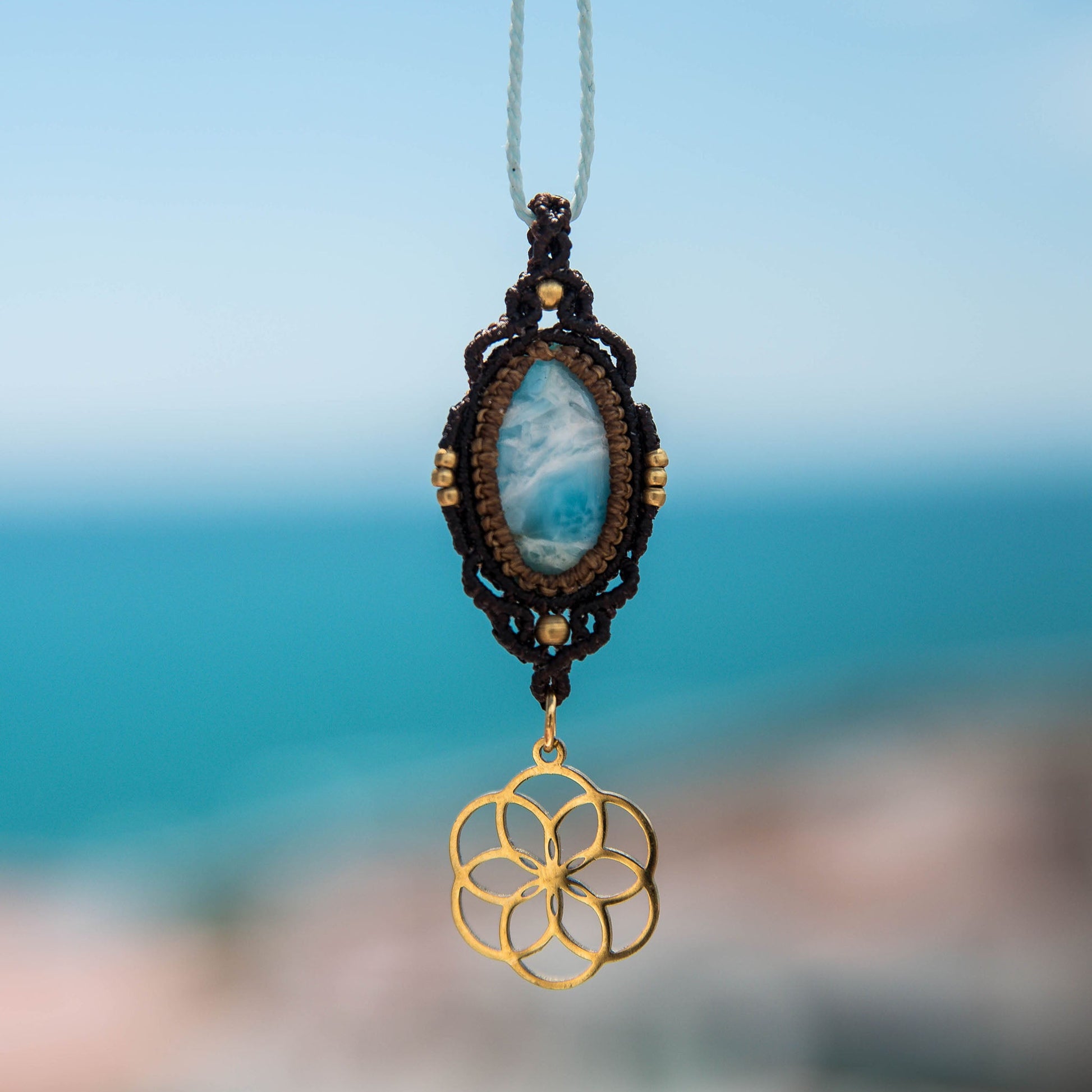 Collar con Larimar tejido en tonos marrones y azul cielo con detalles de latón y encanto de Mandala de acero inoxidable dorado.