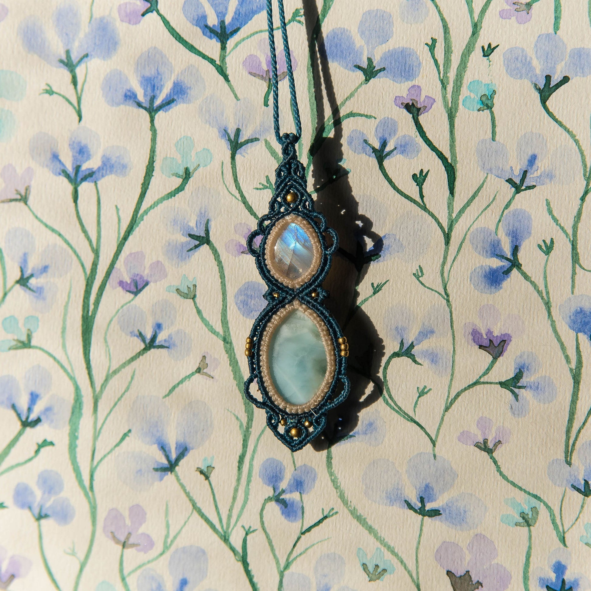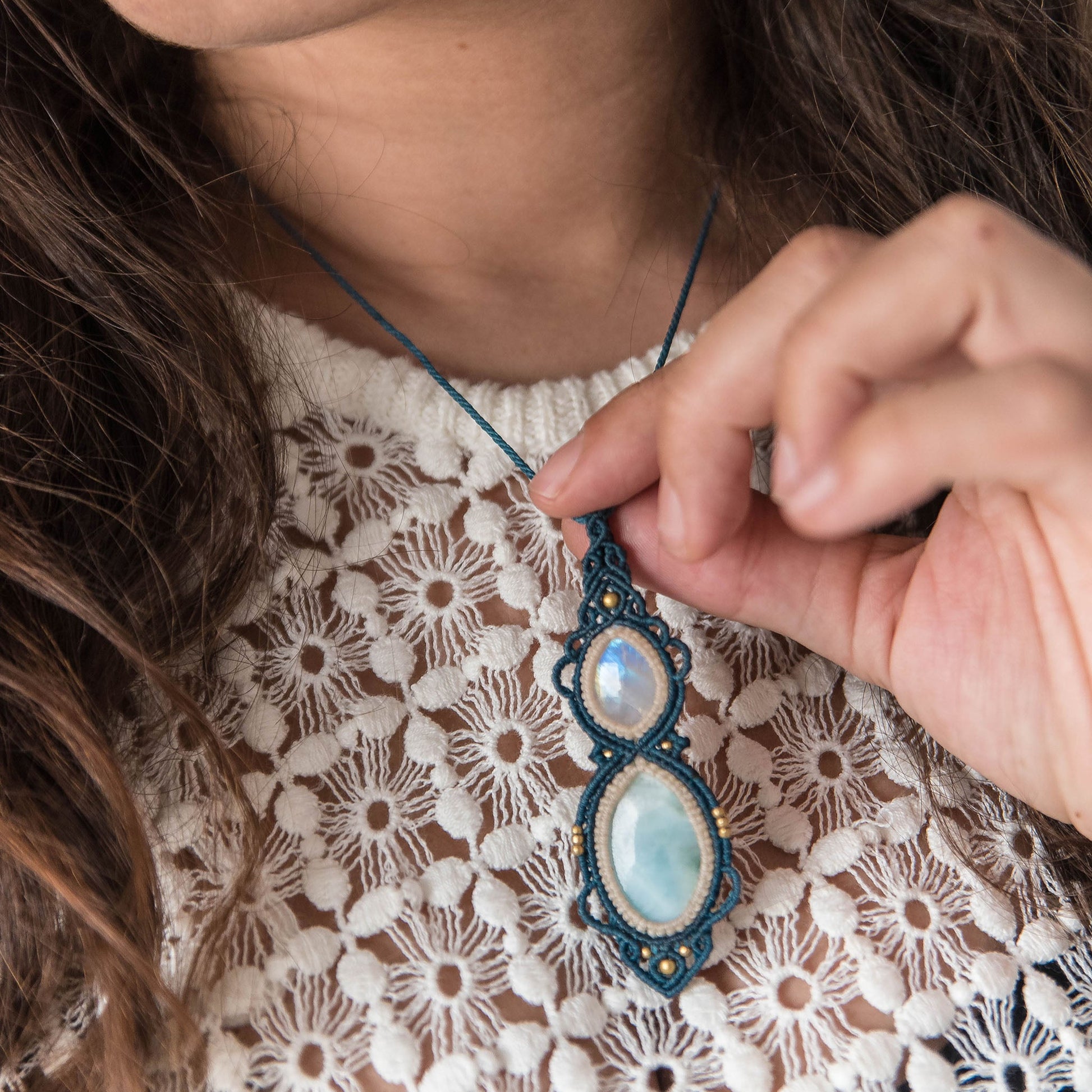 Collar tejidos en tonos blanco crudo y azul con Larimar de República Dominicana y Piedra Lunar Arcoiris de alta calidad.