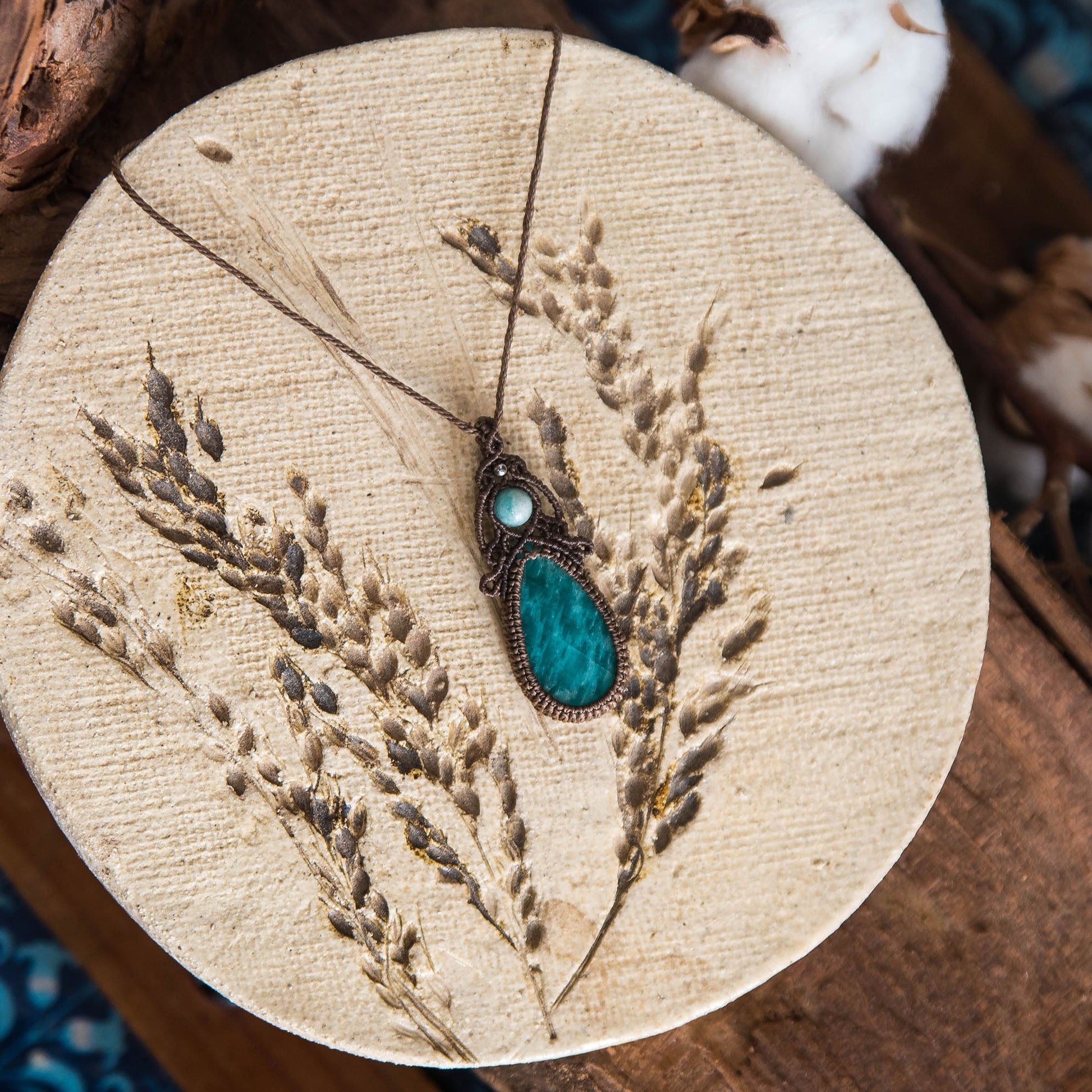 Collar con Amazonitas en tono marrón con cordón ajustable y detalles de acero inoxidable.