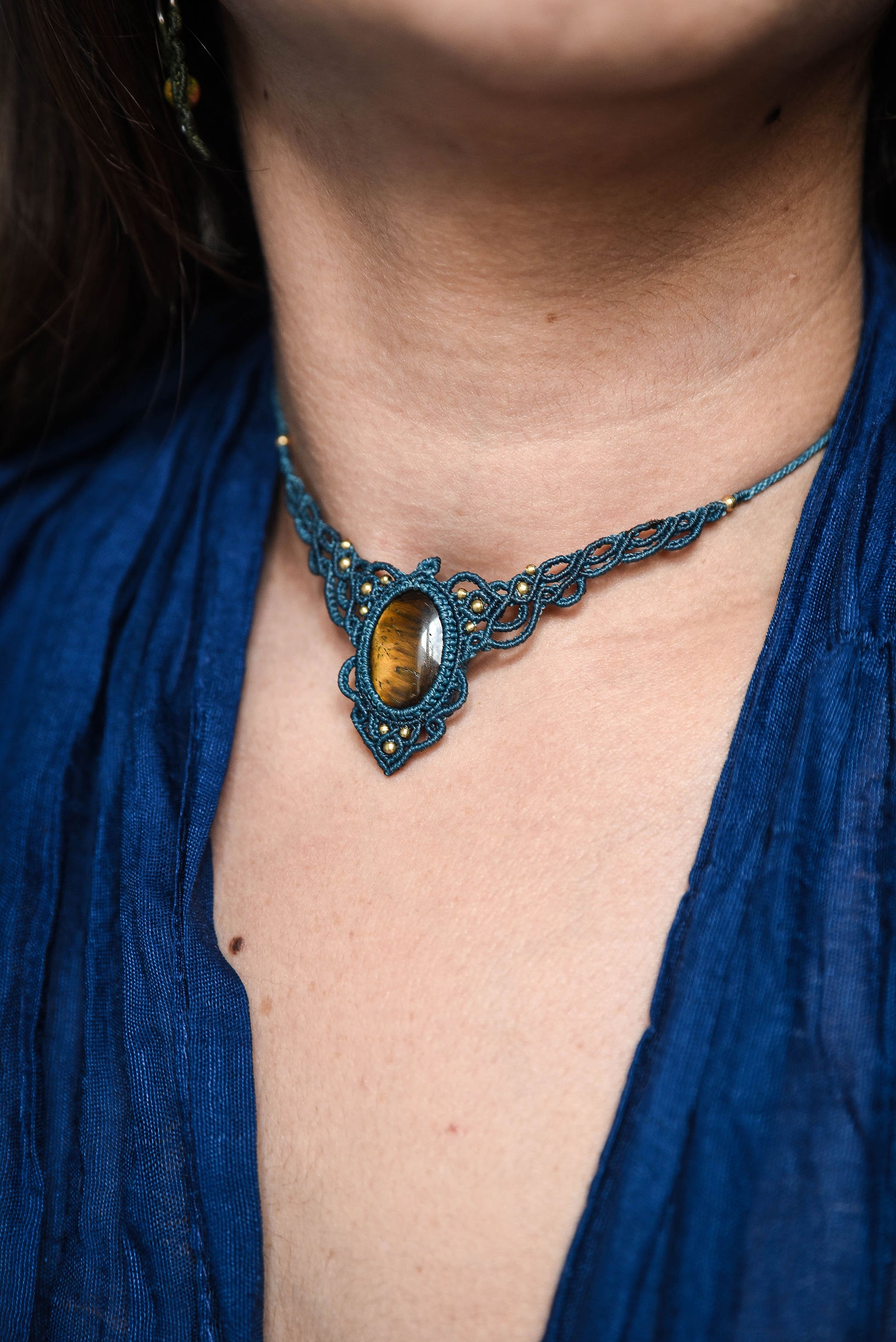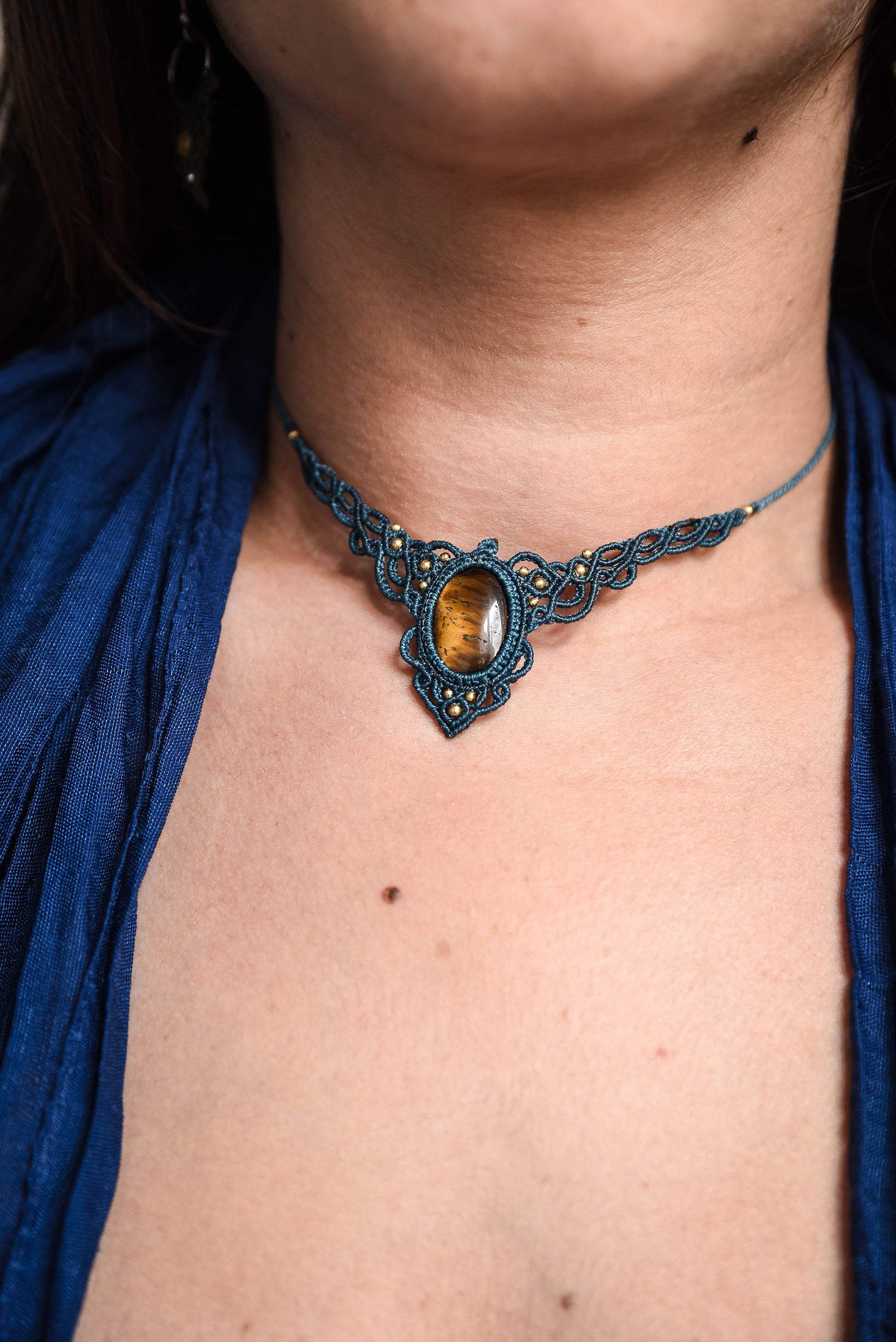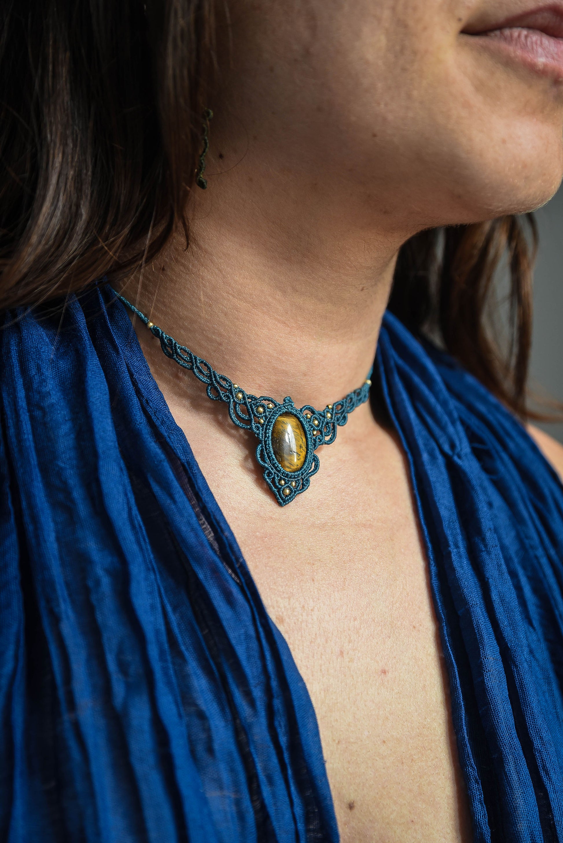 Gargantilla en tono azul con Ojo de tigre y detalles de latón.