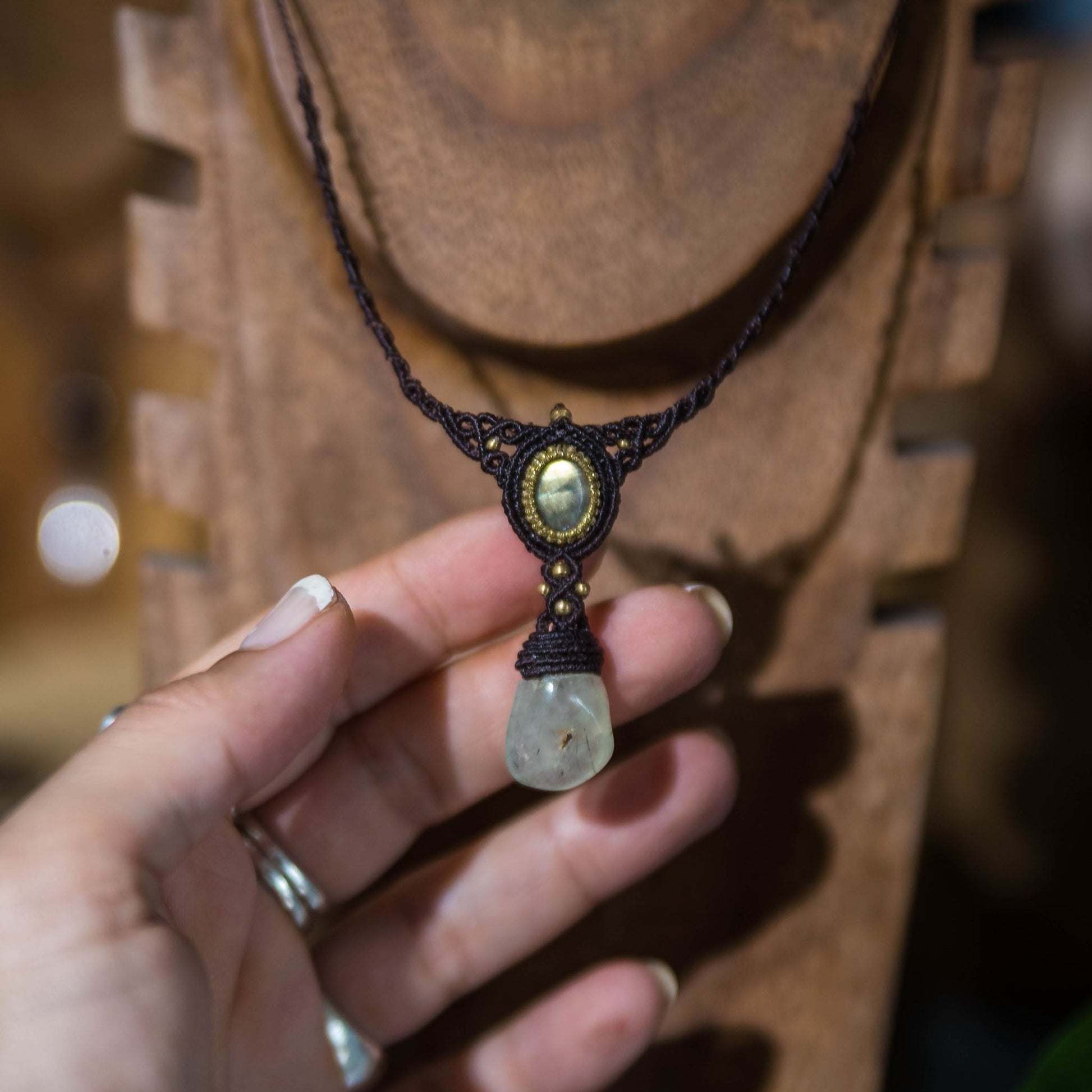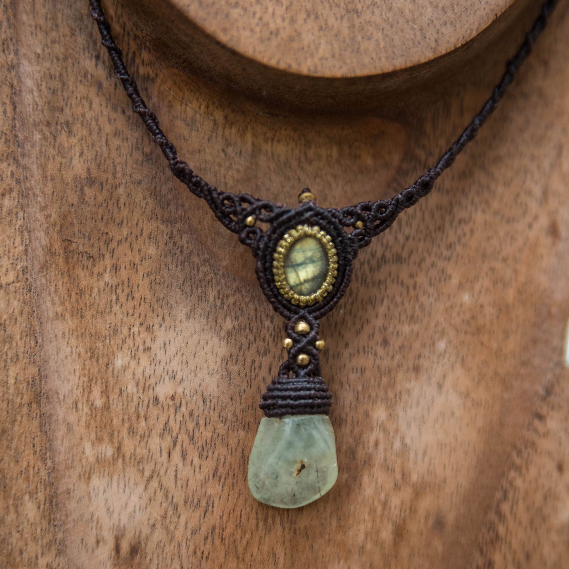 Gargantilla en tonos marrones y dorados, con detalles de latón, Prehnita y Labradorita.